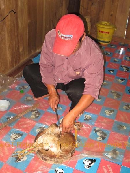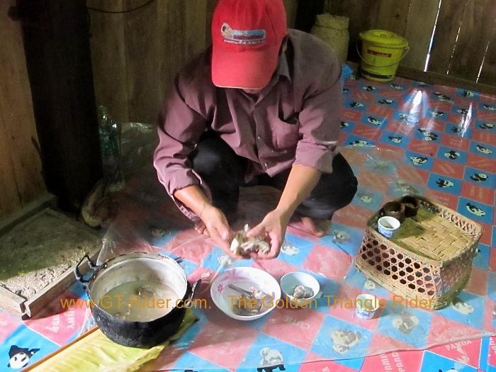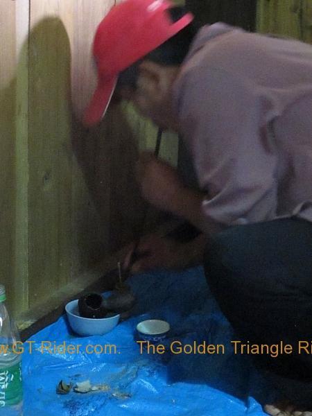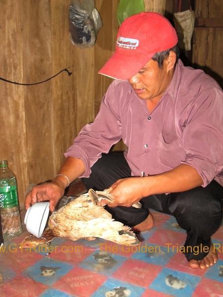 Apparently in Akha legend, there was a plague of bugs that was destroying the crops. The legend says that one guy found a poison for the bugs but they wouldn't eat it. His solution to that dilemma was to use his blood to attract the bugs to eat the poison. This worked well but unfortunately it did take up all his blood to get the job done and he died as a consequence. And so the ceremony is to give thanks and to remember this poor chap for saving the crops and the continuation of the Akha race.
